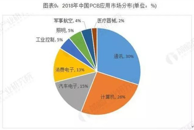 電子信息產業(yè)的蓬勃發(fā)展是PCB行業(yè)發(fā)展的重要助力。從下游應用領域分布來看,2018年通訊行業(yè)的PCB市場規(guī)模最大,占比約為33.4%;其次是計算機行業(yè),占比約為29.4%。其他領域PCB市場規(guī)模較大的是消費電子、汽車電子。
