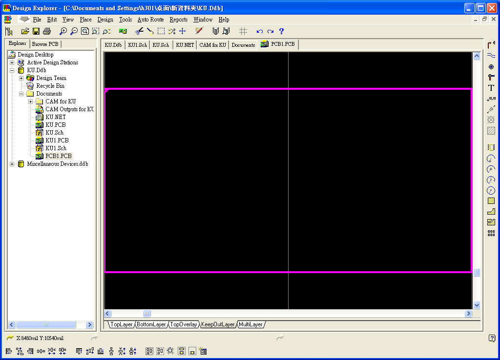 雙擊新命名之PCB檔,進(jìn)入PCB布線畫面,先點(diǎn)選畫面下方之KeepOutLayer頁(yè)面標(biāo)籤,再用畫面右側(cè)之繪圖線畫出邊框線,如圖14。畫面一樣用PageUp或PageDown調(diào)整至適合大小做繪圖。